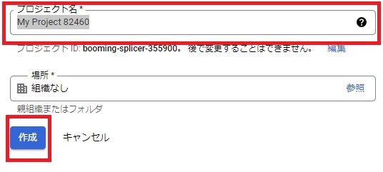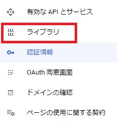 すると、プロジェクト名を入力する小窓が表示されますのでプロジェクト名を入れます。プロジェクトを生成する時に自動で決定されるプロジェクトIDは変更不可能ですがプロジェクト名自体は変更可能ですので適当でも構いません。プロジェクト名を入れたら下部の【作成】ボタンを押します。これでプロジェクトを作成できました。次にAPIキーを有効にします。左のメニューの【ライブラリ】をクリックします。