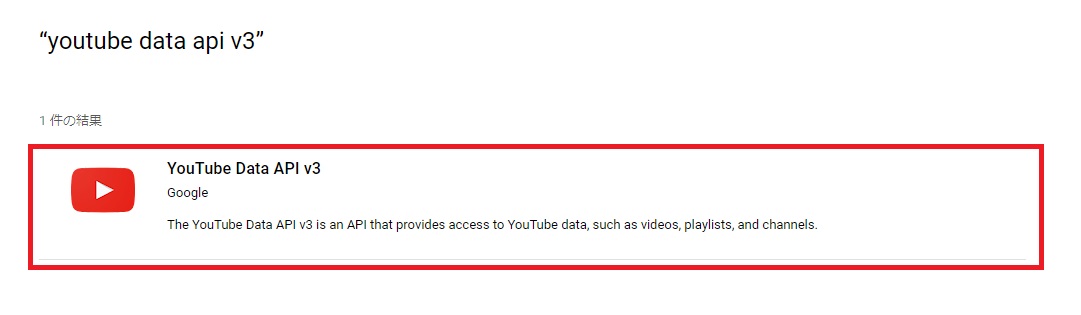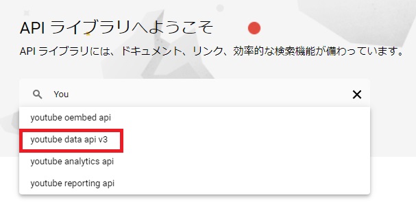 画面中央に検索窓が出てくるので『you』といれると入力候補に【youtube data api v3】と出てくるのでこれを選択します。
