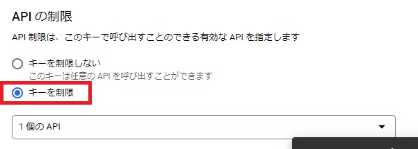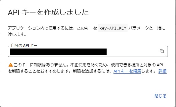 これで、APIキーを使用することができますが、念の為制限をかけておきます。不正使用防止の為です。上記の画面を閉じます。