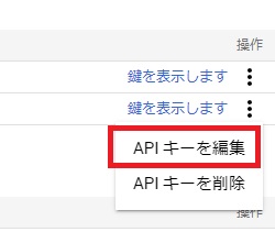 APIキーの所の右端の【操作】の所の縦〇をクリックすると【APIキーを編集】と出てきますのでこれを選択します。