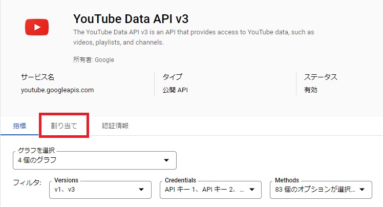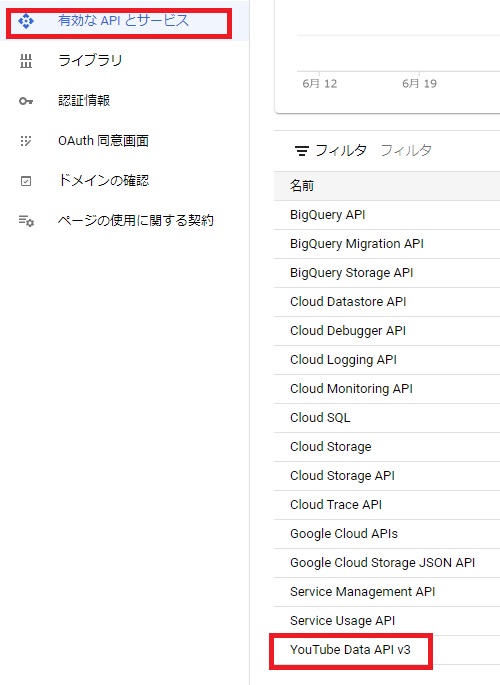 Youtube APIキーにはYoutubeにリクエストしてデータが帰ってくる際に量的使用制限があります。リクエストの種類や使用量によって変わりますが、もし制限を迎えてしまった場合はその日はそのキーを使用することは出来ません。他のキーを使うか日付(Youtube本社の現地時間)が変わるのを待つしかありません。ここから使用量(割り当て)の確認方法を説明します。先ほどまでの画面の左側のメニューの【有効なAPIとサービス】をクリック。